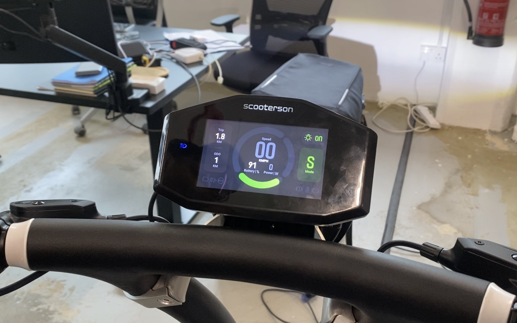 The dashboard design is consistent with the scooter’s industrial design and scooterson’s VI.