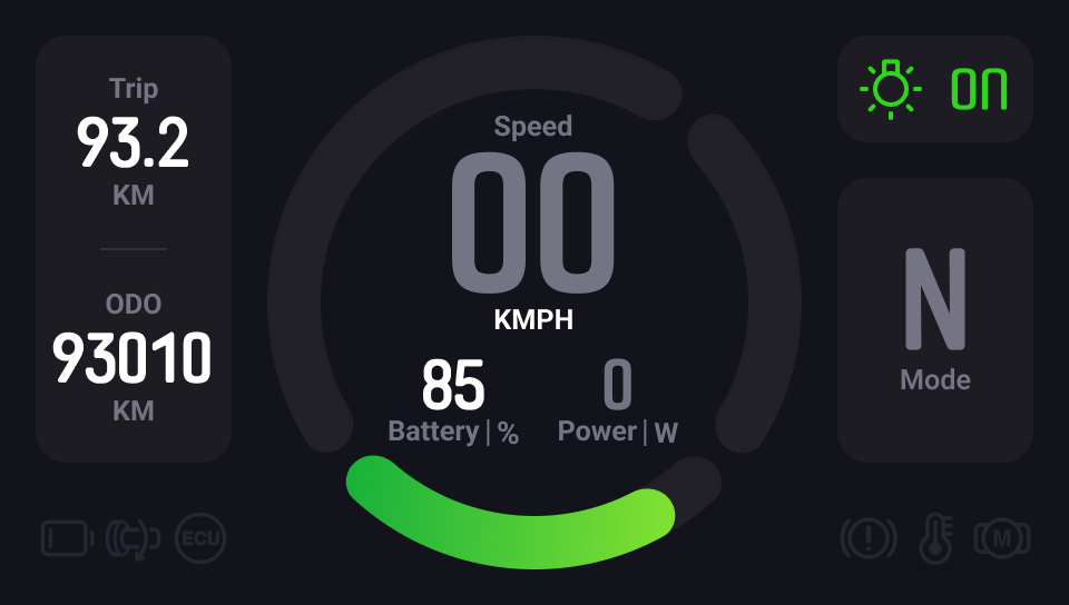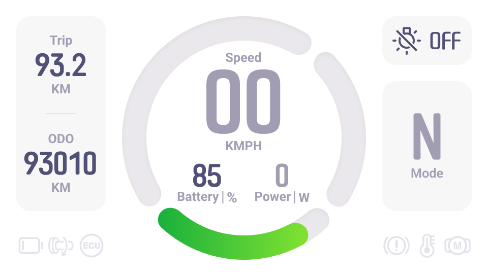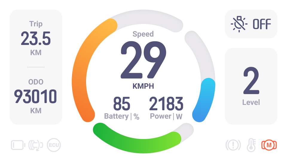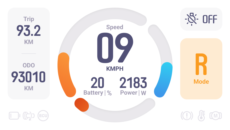 The Scooter Dashboard, as an overview of information, should not distract the rider. As a result, we eliminated as much unnecessary information as possible.
